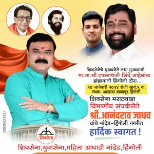 तर, नांदेड-हिंगोलीमध्ये मा.मुख्यमंत्री एकनाथ शिंदे साहेब यांच्या अखाडा बाळापूर येथे दि.१० जानेवारी २०२४ रोजी ठिक ५ वाजता होणाऱ्या विराट सभेच्या पार्श्वभूमीवर मराठवाडा विभागाचे संपर्कनेते तथा नांदेड-हिंगोलीचे संपर्कप्रमुख मा.आनंदराव जाधव व महिला संपर्कप्रमुख सौ.रत्नमालाताई मुंंडे यांच्या उपस्थितीत हिंगोली लोकसभा परिक्षेत्रात बैठकांचे आयोजन करण्यात आल्याची माहिती शिवसेना मध्यवर्ती कार्यालयातून देण्यात आली आहे. शिवसेनेचे मुख्यनेते तथा राज्याचे लोकप्रिय *मुख्यमंत्री माननीय.श्री.ना.एकनाथजी शिंदे साहेब* यांची येत्या *10 जानेवारी रोजी सायंकाळी 5 वा. हिंगोली शिवसेना शिवसंकल्प अभियान निमित्त आखाडा बाळापूर येथे भव्य सभा होणार* आहे. त्याअनुषंगाने दिनांक-7 जानेवारी 2024 रोजी