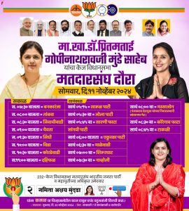 • उमेदवारी अर्ज काढून घेतलेल्या भाजपाच्या माजी आमदार संगीता ठोंबरे यांच्या सर्वच समर्थकांचा महायुतीच्या उमेदवार नमिता मुंदडा यांना जाहीर पाठिंबा.