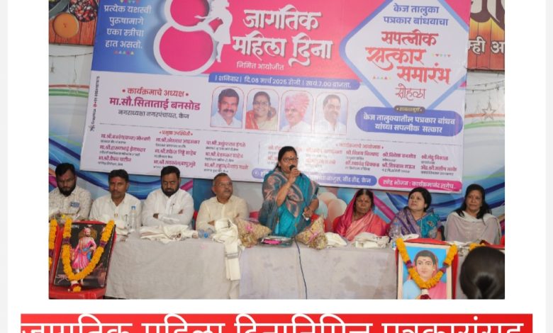 कार्यक्रमाची सुरुवात दिप प्रज्वलनाने करण्यात आली.महापुरुषांच्या प्रतिमेला पुष्पहार अर्पण करुन स्व.सरपंच संतोष देशमुख यांना श्रद्धांजली अर्पण करण्यात आली. यावेळी केज कृषी उत्पन्न बाजार समिती सभापती श्री.अंकुशराव इंगळे यांनी जागतिक महिलादिनाच्या शुभेच्छा दिल्या तसेच नगराध्यक्षा सौ.सिताताई बनसोड यांना स्ञिरत्न पुरस्कार मिळाल्या बद्दल बनसोड यांचे अभिनंदन करुन केज नगर पंचायत करीत असलेल्या विकास कामाबद्धल समाधान व्यक्त केले.जनविकास परिवर्तन आघाडी प्रमुख श्री.हारुणभाई ईनामदार यांनी आपल्या शेरोशायरी तुन आपल्या भाषणातुन आपण ईनामदार आहोत. केज शहराच्या विकासा साठी सर्व पक्षाकडे मागणी करण्यासाठी तत्पर असल्याचे सुतोवाच केले.