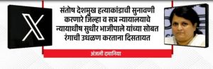 दरम्यान, केज येथील जिल्हा व सत्र न्यायालयात संबंधित माननीय न्यायमूर्तीसमोर अनेक महत्त्वाचे आणि मोठमोठे खटले चालू असल्यामुळे संतोष देशमुख हत्या प्रकरणाच्या खटल्याप्रमाणे निर्माण झालेल्या संशयाप्रमाणेच इतर खटल्यांच्या कामकाजाबाबत देखील मोठा संशय निर्माण झाल्याच्या प्रतिक्रिया व्यक्त करण्यात आल्या आहेत. संतोष देशमुख हत्या प्रकरणात सक्तीच्या रजेवर पाठवलेल्या पोलिसकर्मचारी या प्रकरणाची पहिली सुनावणी घेतलेल्या न्यायाधीशांसोबत रंगांची उधळण केल्याचा दावा समोर आला आहे. देशमुख हत्या प्रकरणाची सुनावणी करणाऱ्या न्यायाधीशांसोबतच या प्रकरणात सक्तीच्या रजेवर पाठवलेल्या आणि निलंबित पोलिसांनी धुळवड खेळल्याचा आरोप सामाजिक कार्यकर्त्या अंजली दमानिया यांनी केला आहे.अंजली दमानिया यांनी दोन निलंबित पोलीस अधिकारी आणि न्यायाधीशांचा रंगपंचमी साजरा करतानाचा फोटो ट्विट केला आहे. फोटो तपासा आणि अधिक खात्री करा, असंदेखील अंजली दमानिया फोटो शेअर करताना म्हणाल्या आहेत. दरम्यान, दमानिया यांनी ट्विट केलेल्या फोटोची “पाठलाग न्यूज ” पुष्टी करत नाही. अंजली दमानिया यांनी या प्रकरणी माध्यमांनादेखील प्रतिक्रिया दिली आहे.अंजली दमानिया यांनी आपल्या ट्विटमध्ये म्हणतात की, “मस्साजोग गावचे सरपंच संतोष देशमुख यांच्या हत्येने संपूर्ण महाराष्ट्र ढवळून निघालेला आसताना आज धुलवडीला केज मधील साई नगर येथे संतोष देशमुख हत्या प्रकरणामुळे निलंबित पोलीस उपनिरिक्षक राजेश पाटील आणि याच हत्याकांडामुळे सक्तीच्या रजेवर पाठवलेले पोलीस निरिक्षक प्रशांत महाजन हे धुलवडीच्या सप्त रंगाची उधळण करुन आनंद साजरा करताना दिसले. विशेष म्हणजे या दोघांनी संतोष देशमुख हत्याकांडाची सुनावणी घेणारे जिल्हा आणि सत्र न्यायालयाचे न्यायाधीश सुधीर भाजीपाले हे साई नगर केजमध्येच राहतात. ते या हत्या प्रकरणात संशयित आरोपी असलेल्यांसोबत रंगाची उधळण करताना दिसत आहेत. आता न्यायाधीशांचे जर आरोपीनां वाचवणारे हे निंलबित आधिकारी यांच्यासोबत केस चालू असताना, न्यायमूर्ती होळी खेळत असतील तर हे चुकीचे आहे”, असं अंजली दमानिया म्हणाल्या आहेत.”विष्णू चाटेच्या ऑफिसमध्ये 29 नोव्हेंबरला जी बैठक झाली, त्या बैठकीत सगळेच्या सगळे कट करणारी लोकं उपस्थित होती. त्यांच्याबरोबर तिथे उपस्थित राहणारे अधिकारी होते तत्यातील हे राजेश पाटील आणि पीआय प्रशांत महाजन असे हे दोन व्यक्ती जेव्हा न्यायाधीशांसोबत दिसतात तेव्हा हे चुकीचं आहे. माझी अशी मागणी आहे की, यापुढे ही जी सुनावणी आहे, ती या न्यायाधीशांकडून काढून घ्यावी, अशी मागणी न्याय व्यवस्थेकडे करणार आहे. तसेच प्रिन्सिलपल जज यांच्याकडेही करणार आहे. संबंधित न्